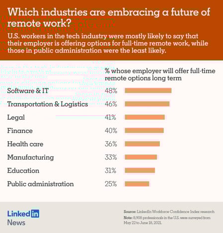 The most recent edition of LinkedIn’s Workforce Confidence survey identified that “it’s likely that each industry will define its unique norms, along the lines seen in the chart below.” These results were based on surveys of nearly 9K LinkedIn respondents in the US, of which “were asked a variety of questions about what new work arrangements their employees might be offering, including the option of long-term remote work for full-time employees.”